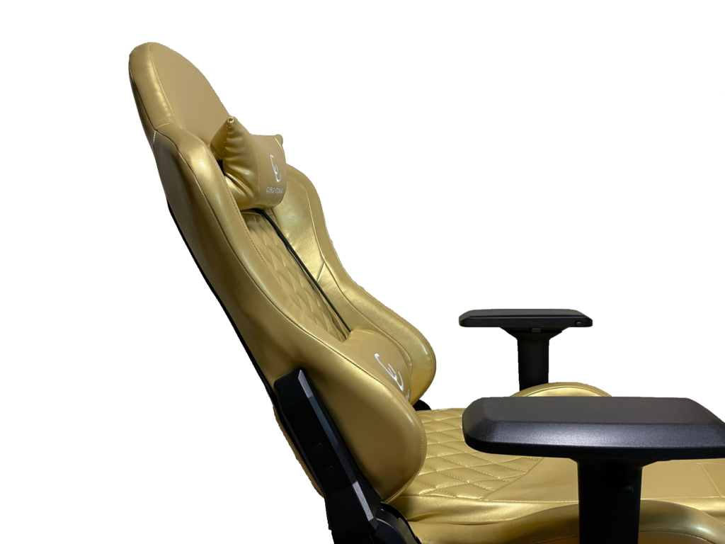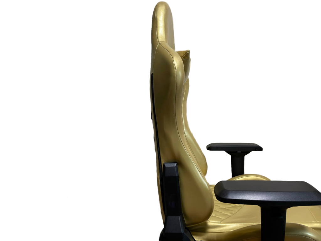 色は見事に金色です! 座面は金色、ロゴは白、その他は黒ですね。 座面の素材はPU。布地の表面にポリウレタン樹脂を塗布し、質感を天然皮革に似せた合成皮革です。 クッション材はウレタンフォームです。 座部と足を支える部分やアームレストの土台は金属(スチール)なので、耐久性は問題なさそうです。 足とアームレストはプラスチックですので、先に劣化しそうですね。 The color is wonderfully golden! The seat is gold, the logo is white, and the others are black. The material of the seat is PU. Synthetic leather with polyurethane resin applied to the surface of the fabric to resemble natural leather in texture. The cushion material is urethane foam. Since the part that supports the seat and feet and the base of the armrest are metal (steel), durability does not seem to be a problem. The legs and armrests are made of plastic, so they are likely to deteriorate first.